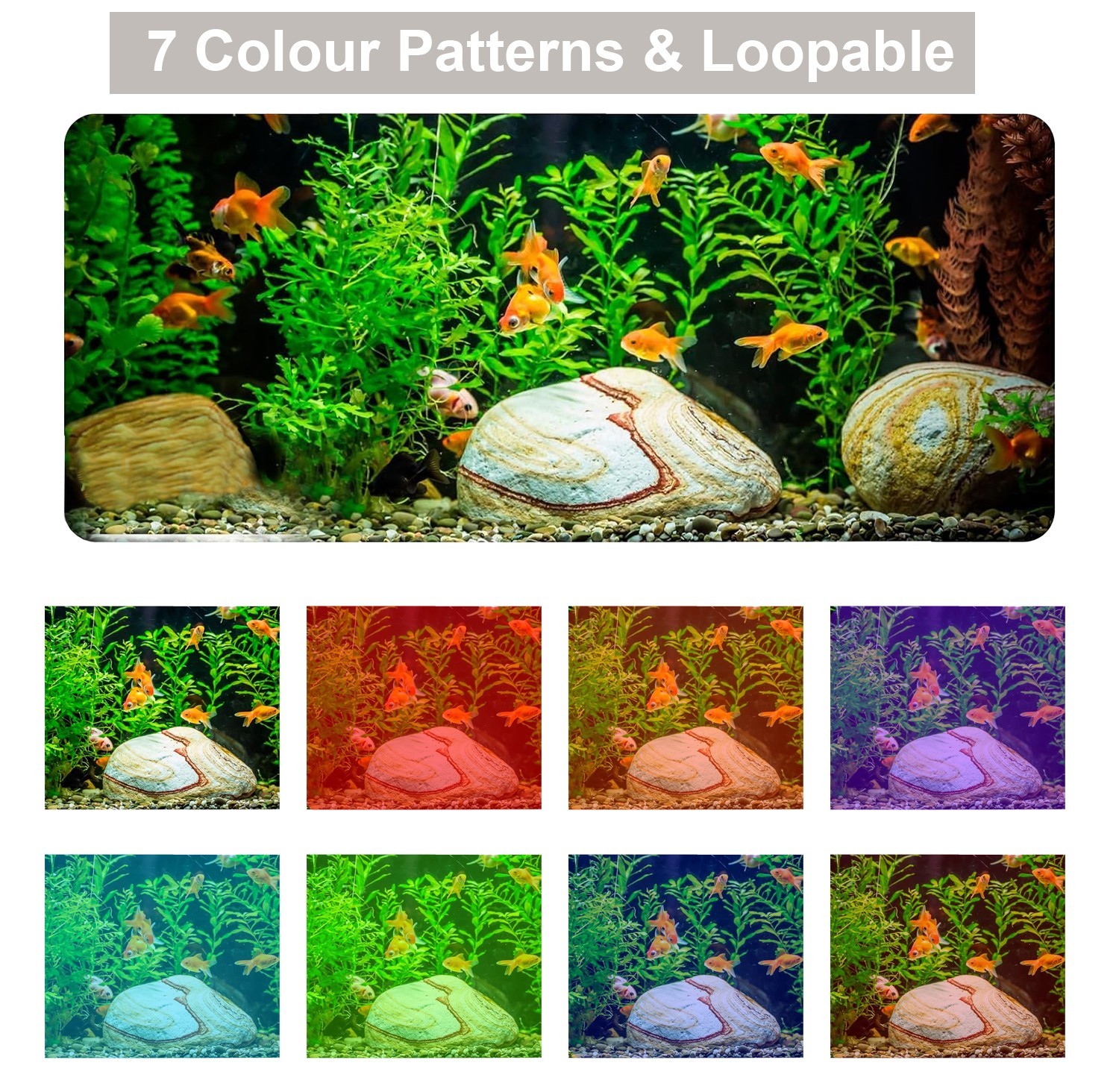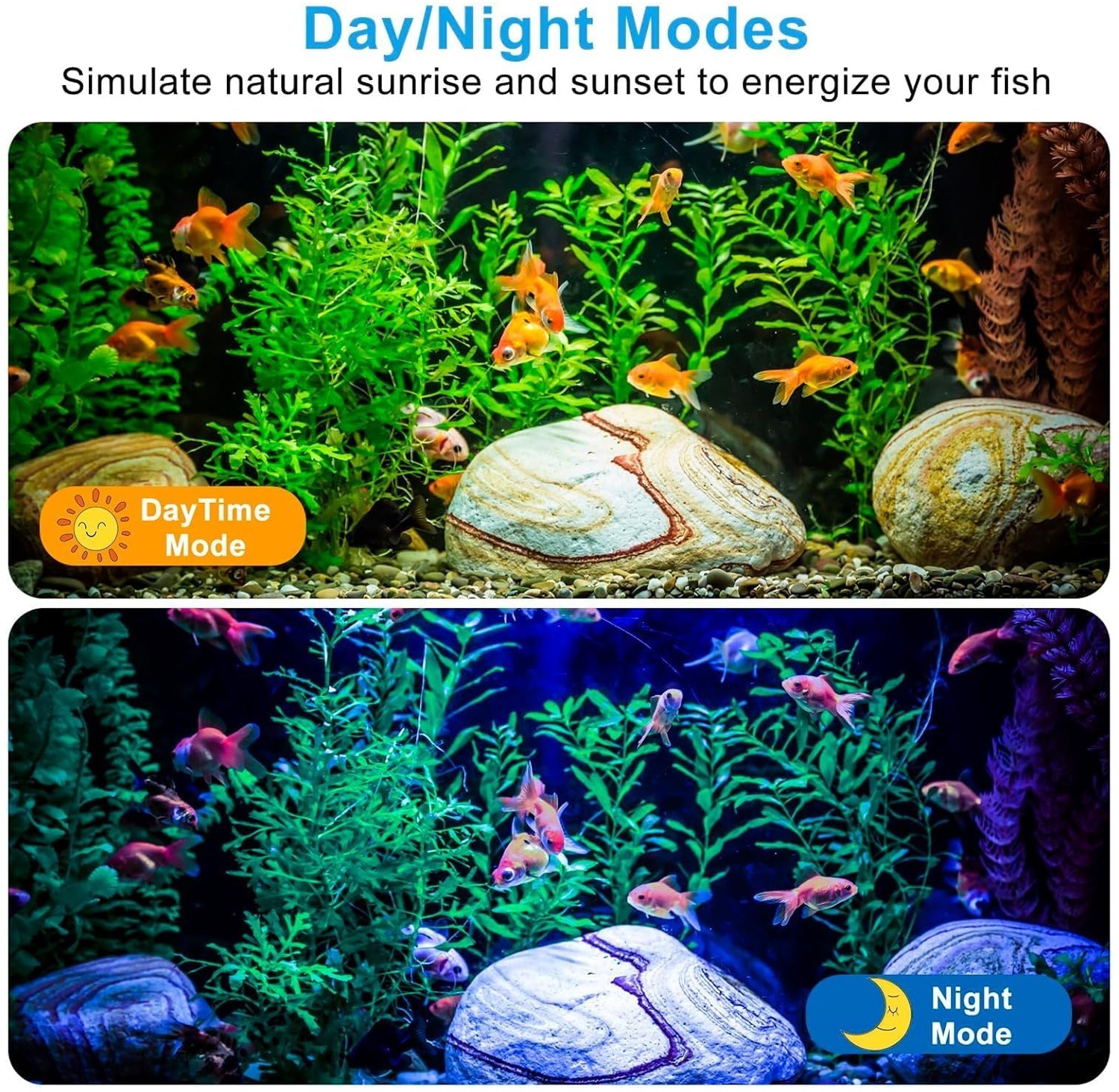 3.Immersive Lighting Effects: 7 dynamic colour modes (loopable) + 8 static/4 dynamic full spectrum scenes.Sunrise/sunset mode reduces stress for fish/plants.