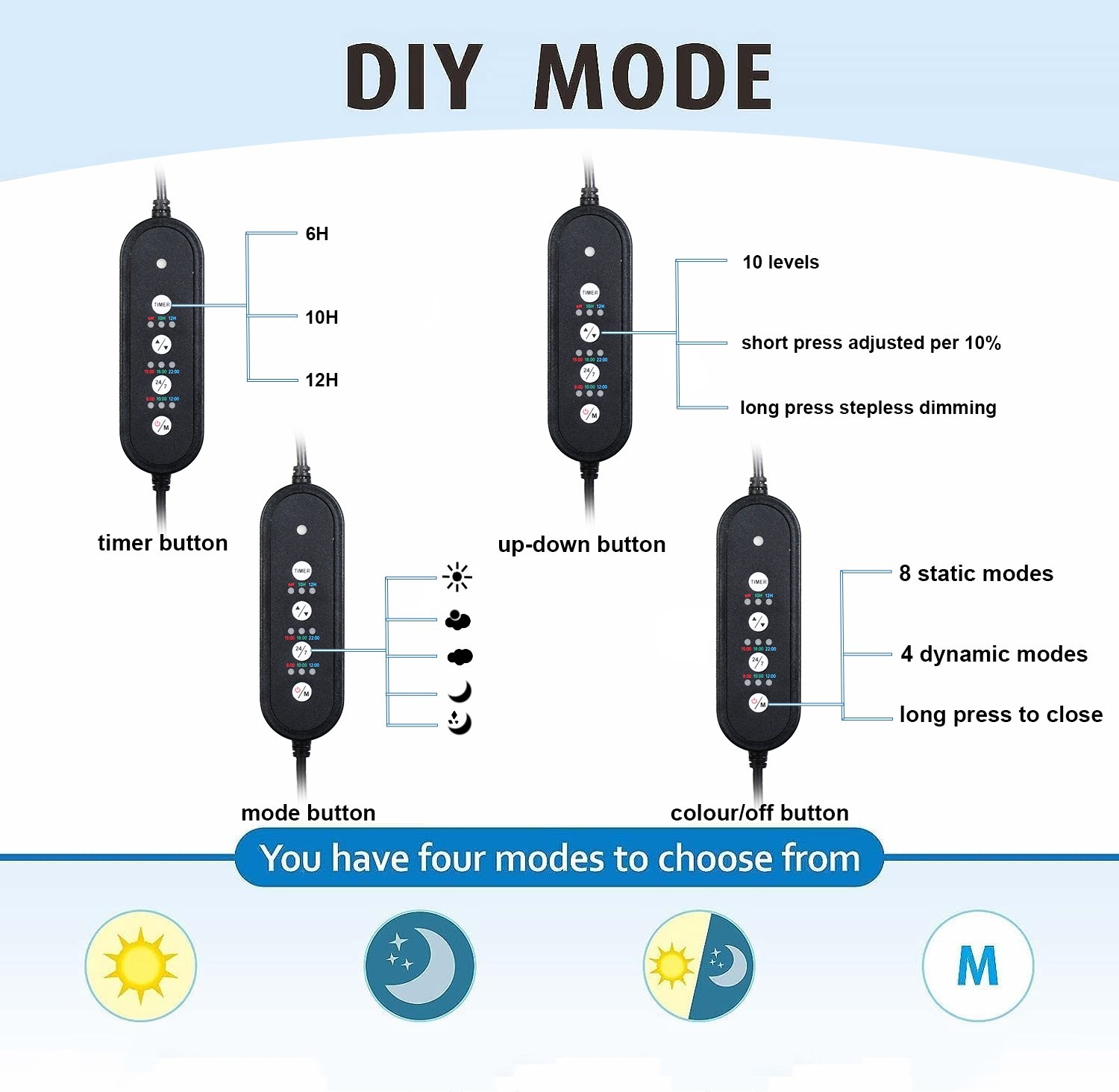 2.Smart Timer & Customisable Brightness: Auto shut-off timer (6h/10h/12h) mimics natural daylight cycles.10-level dimming for energy-saving aquarium light control.